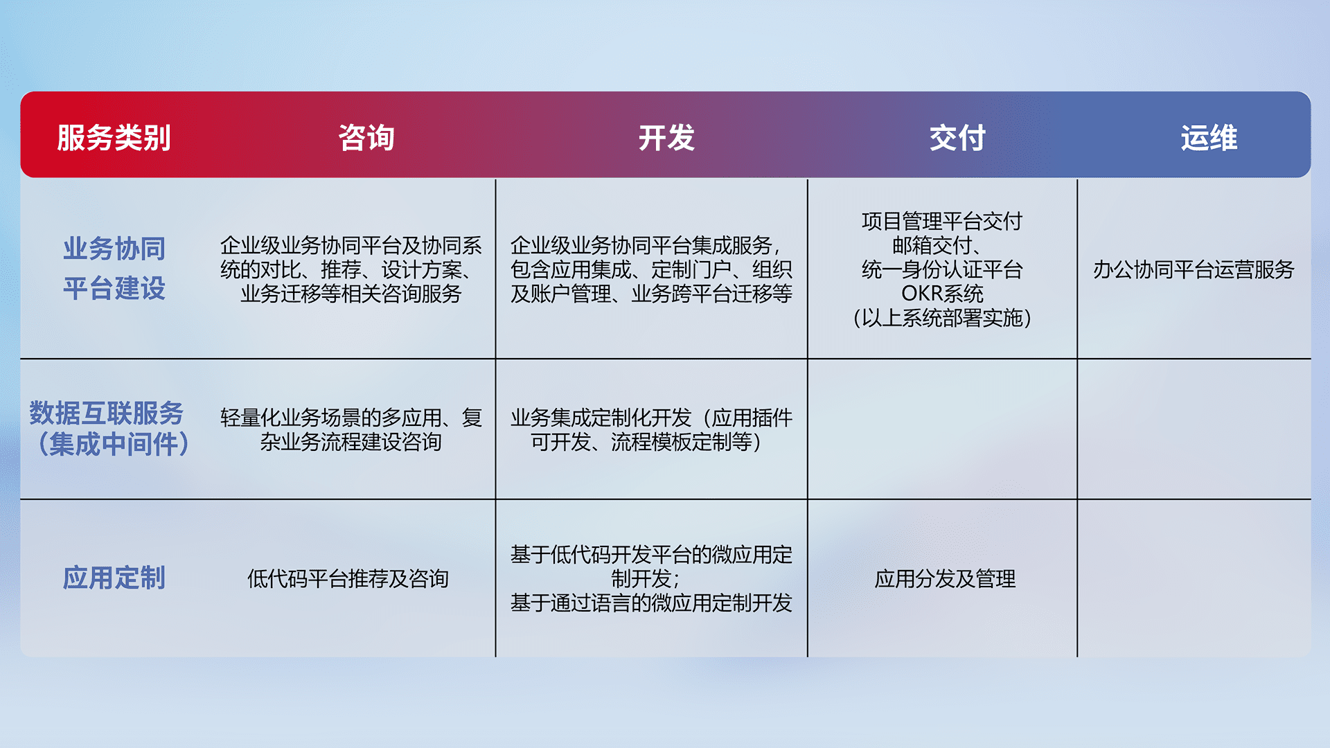 针对钉钉、、企微、、、、IDaas等平台级产品提供产品的规划、、方案、、、交付、、定制化开发等服务,,,实现如统一协同办公、、、、智能客户服务、、、、混合会议管理、、、、智能数据查询、、、等业务场景,,,实现数字化转型。。